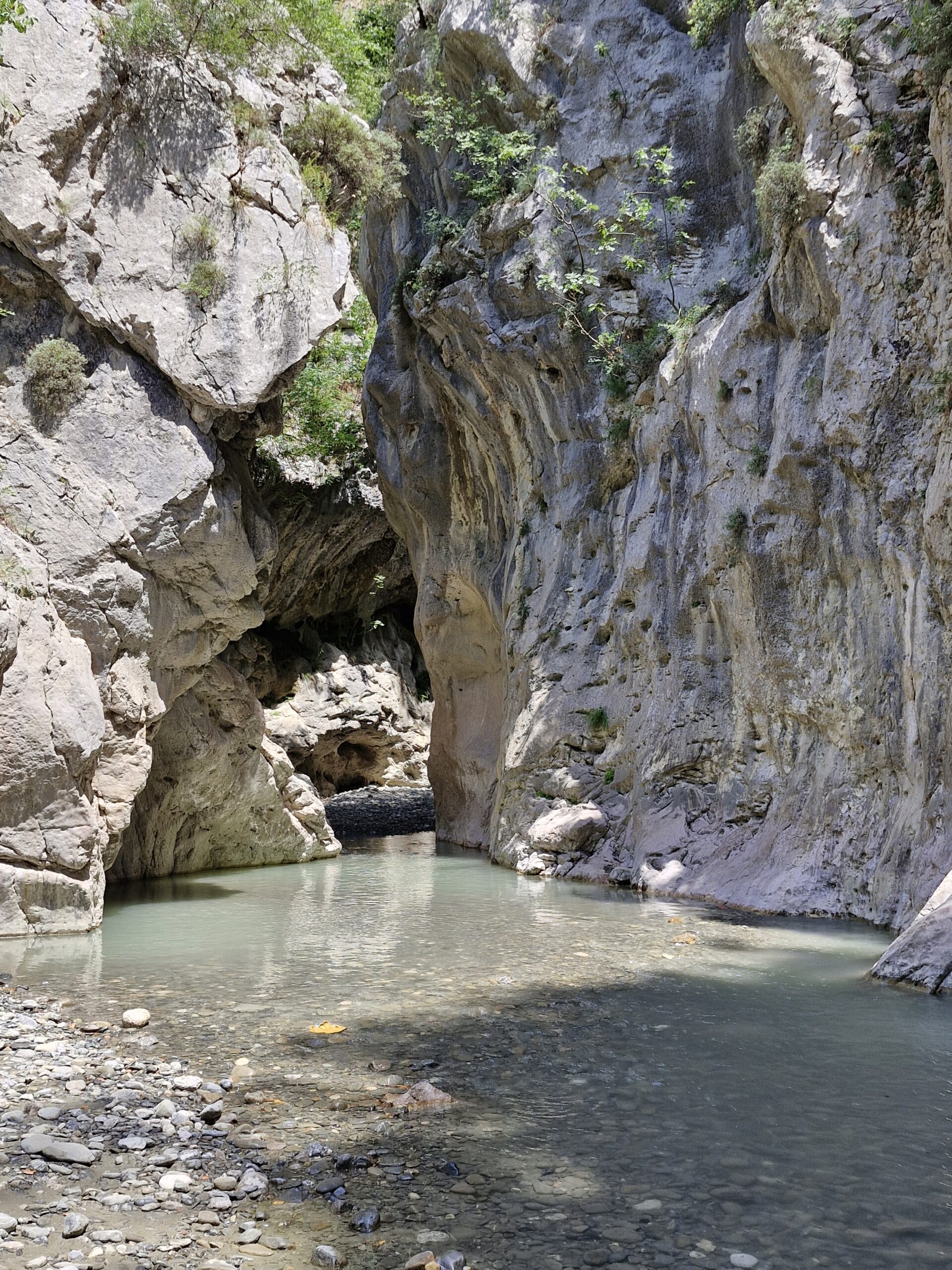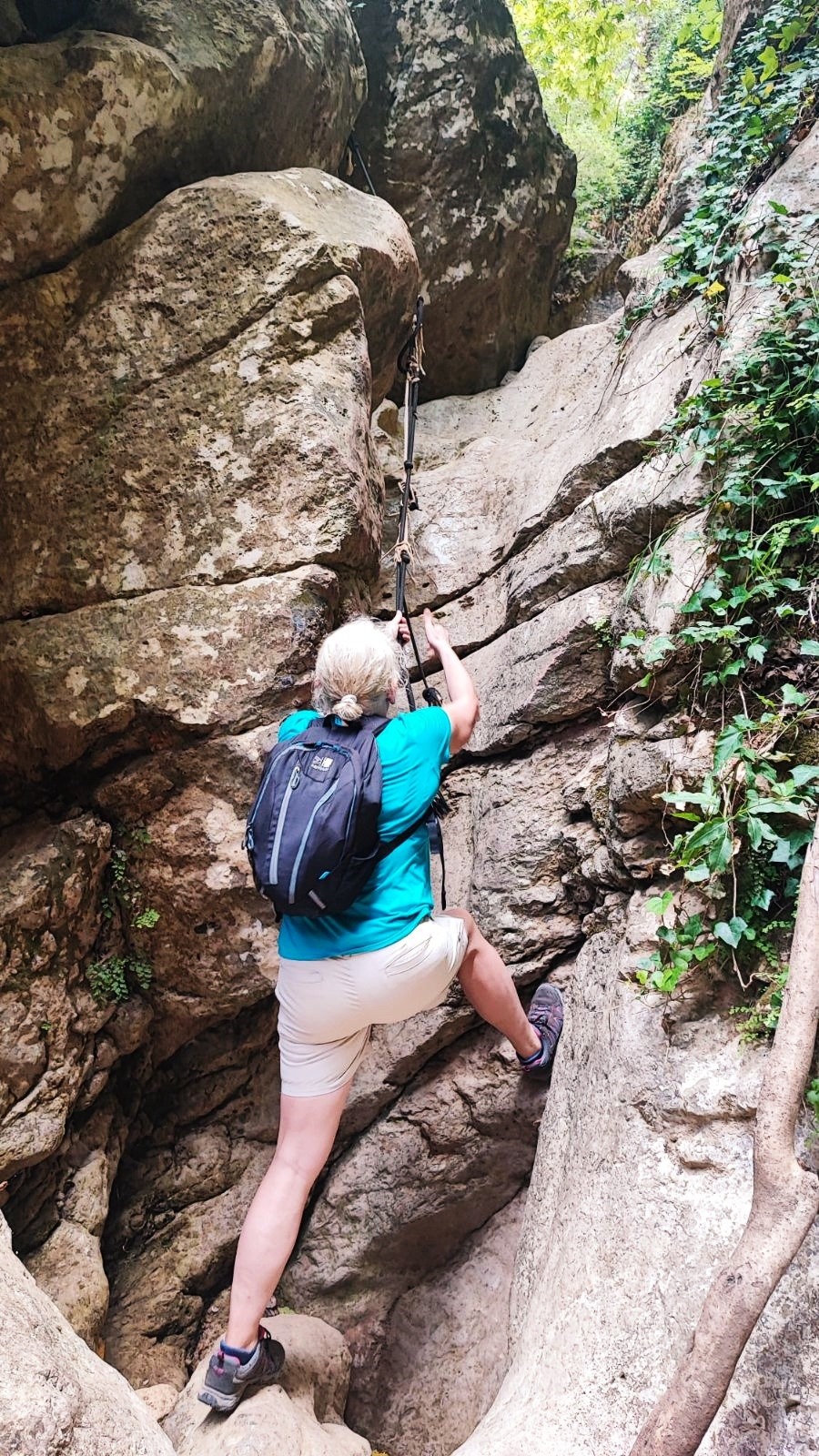 Gjipe Canyon looks very innocent at first; only here and there are boulders. After walking a few dozen meters, the landscape begins to change, to the point where it becomes difficult. The rock blocks are so large and high that they can only be overcome by climbing ropes, of which there are 10. We did the first two (it was easier uphill than down) and returned to the beach. I think that going through the whole canyon requires a guide, so I will attack it next time.