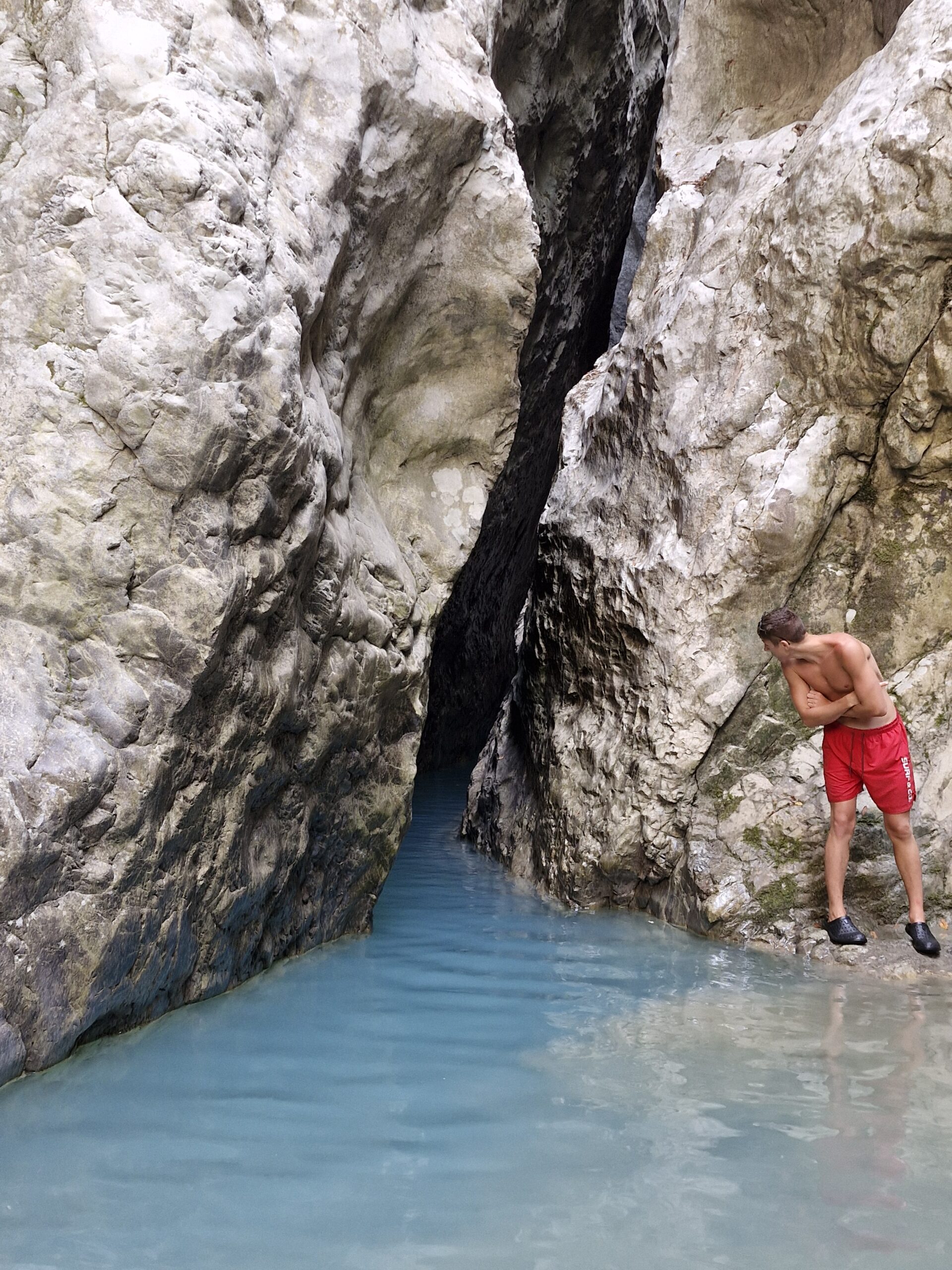 I ended my tour of the canyon behind a large boulder, which required either climbing it or walking around it by wading through the water, which I did. And this time I was immersed in the icy flow up to my chest. An unnecessary sacrifice, because it turned out that the gorge narrowed so much that it was impossible to see how long or how deep the next stream was. Possible swimming through this part was out of the question.