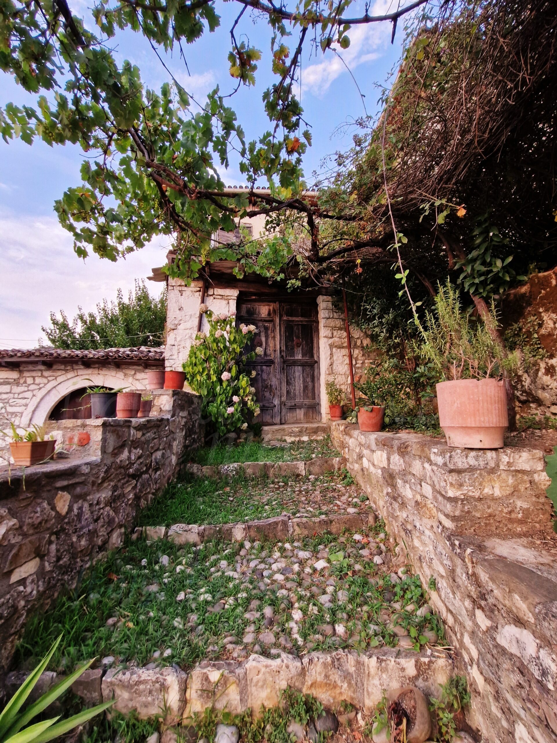 Dhermi, a part of which lies by the sea and a part in the mountains. The town is nothing special, but it is a good base for trips downhill while spending your vacation in Albania. We rented a house in the upper part of the town, which I think is worth visiting, going to the streets above the main road. I really like stone houses and narrow streets with flowers, so the highest part of Dhermi hit my taste. And besides, the view from the top is great.