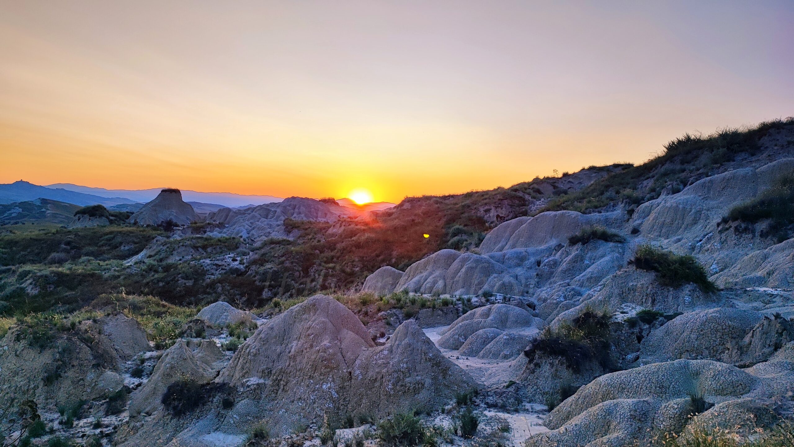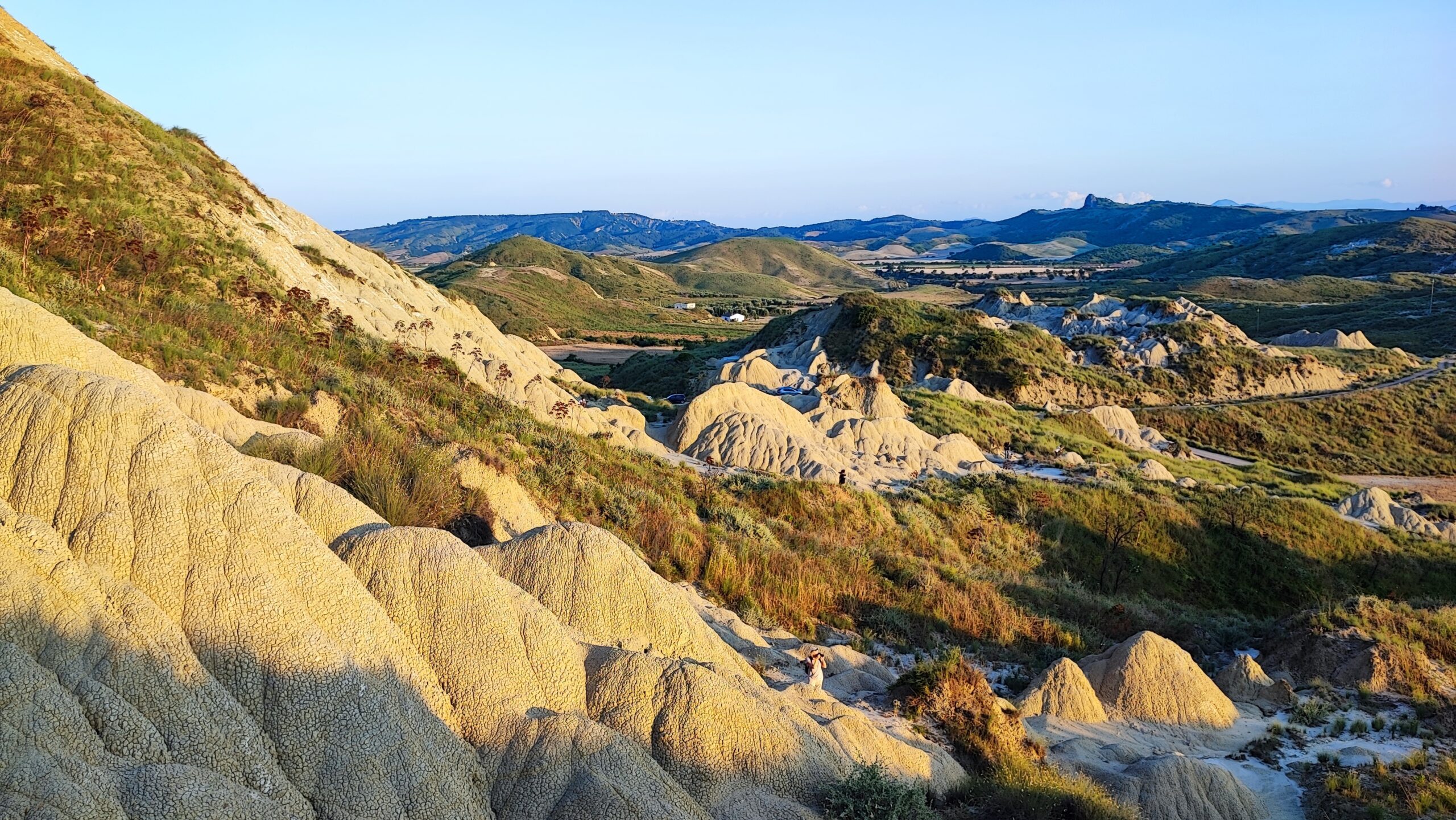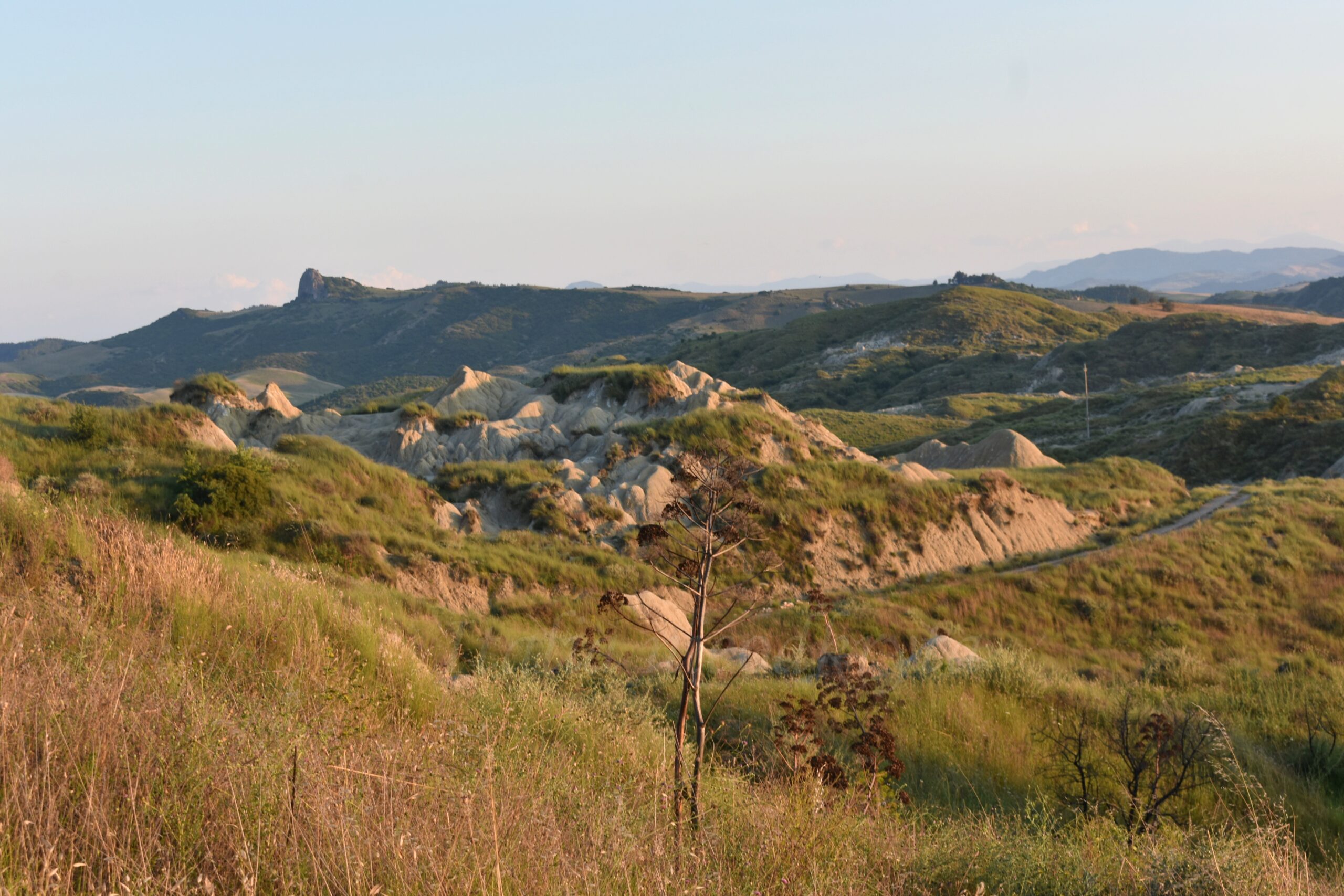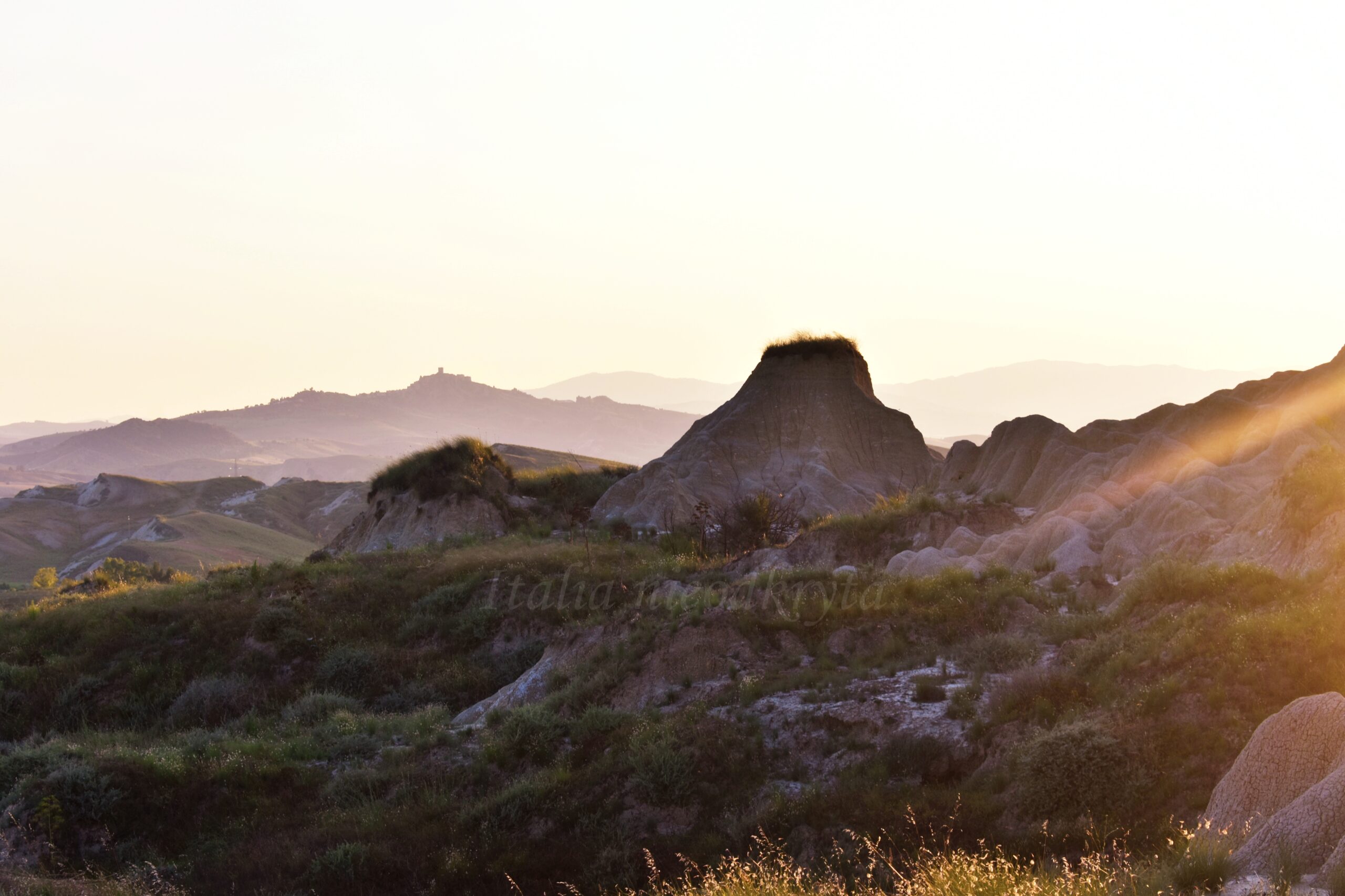 The Basilicata badlands hills are yellowish, dry, and cracked; each mountain has a specific shape, which depends on the state of erosion. Some, the more crumbled ones, have fringes of grass on their tops, and in the rays of the setting the sun they look like giants waiting to wake up. In such surroundings, you can feel like a Lilliputian who accidentally got into another world.