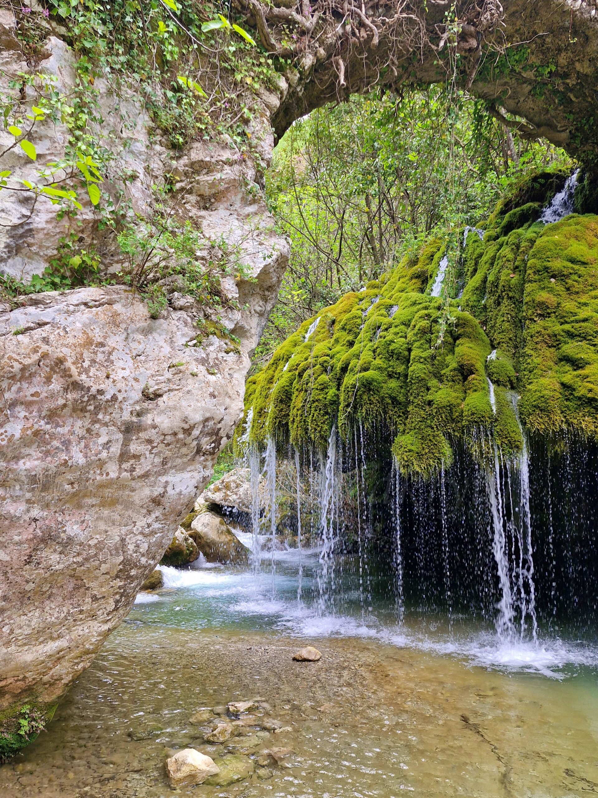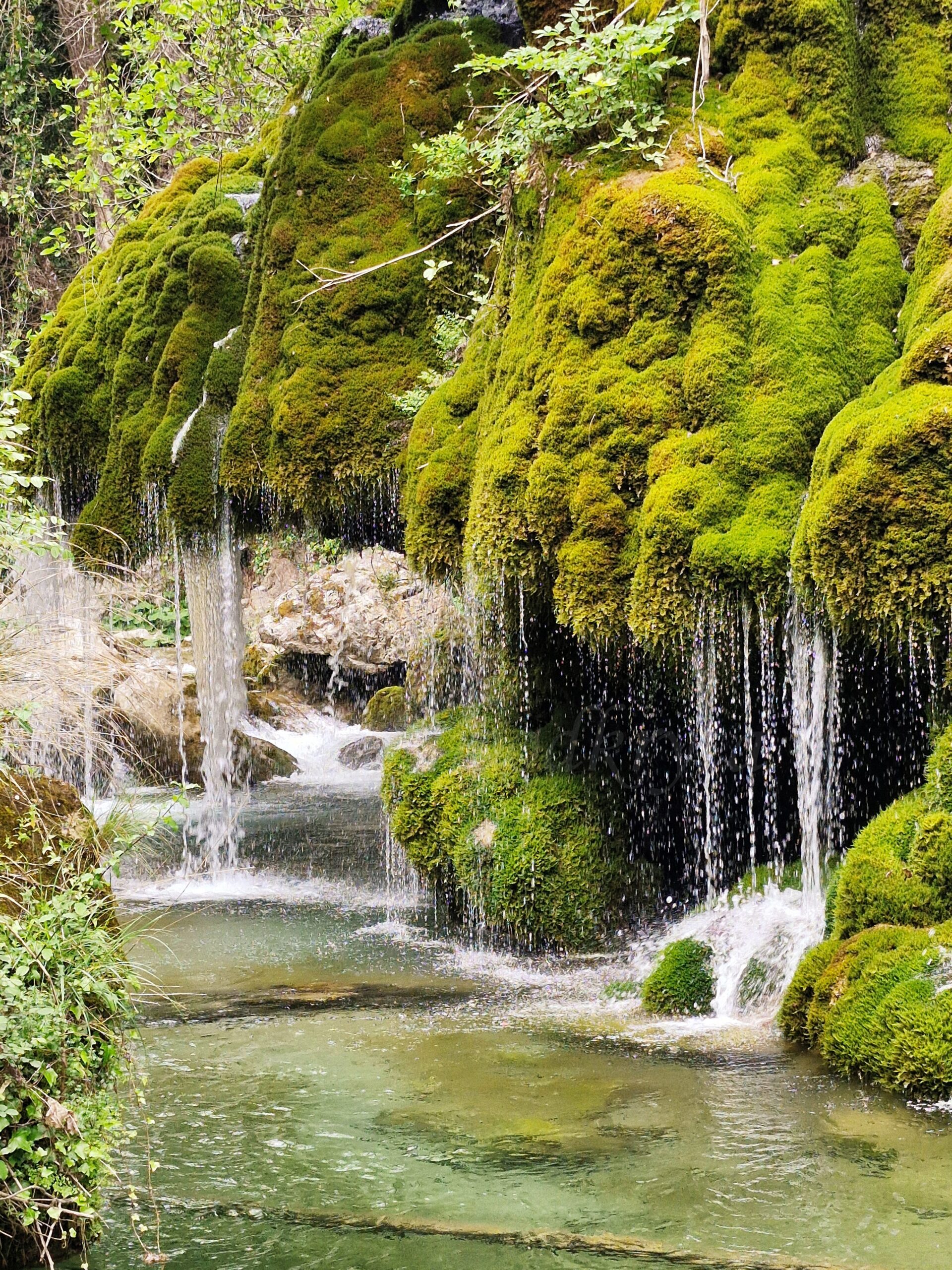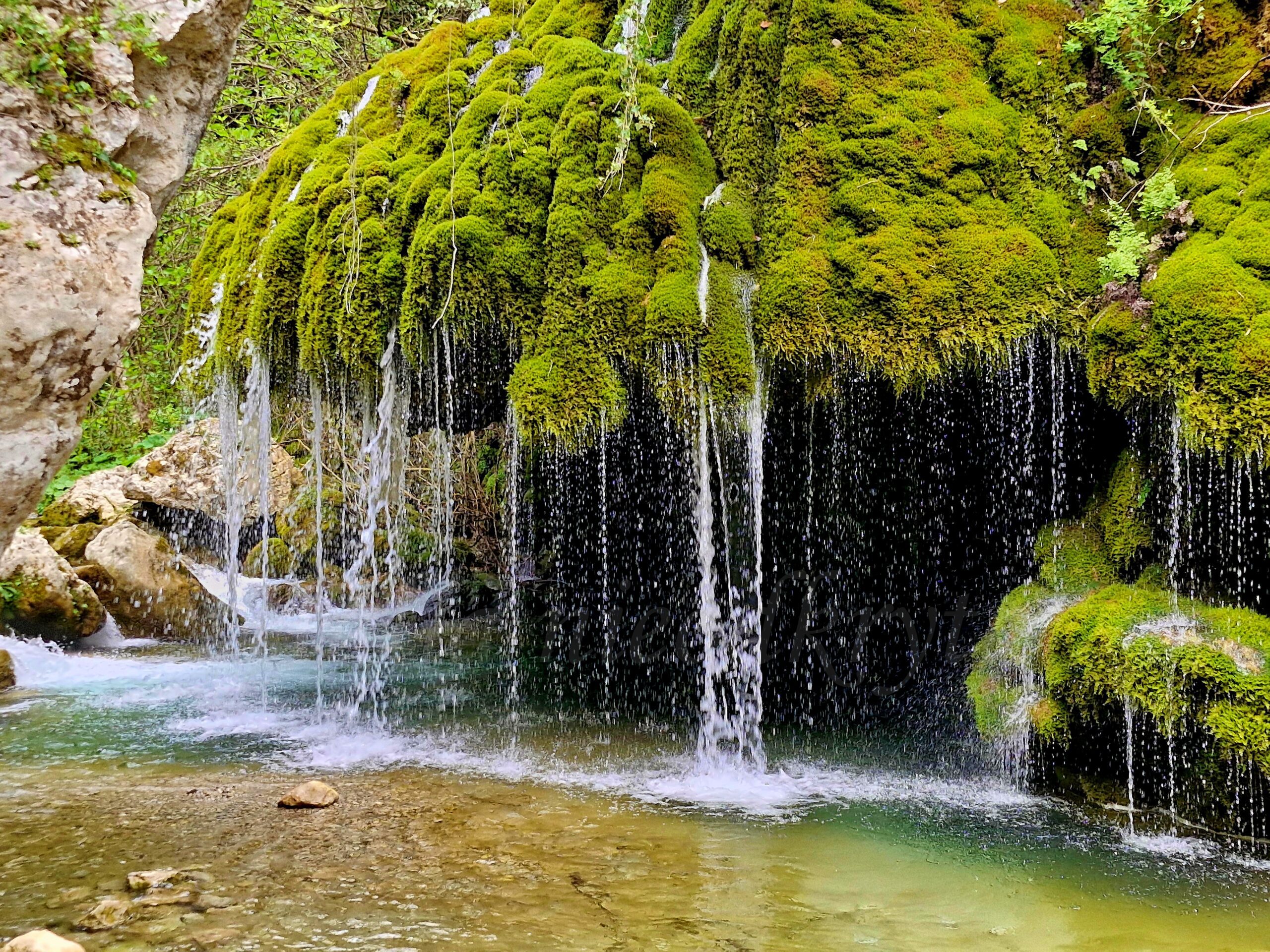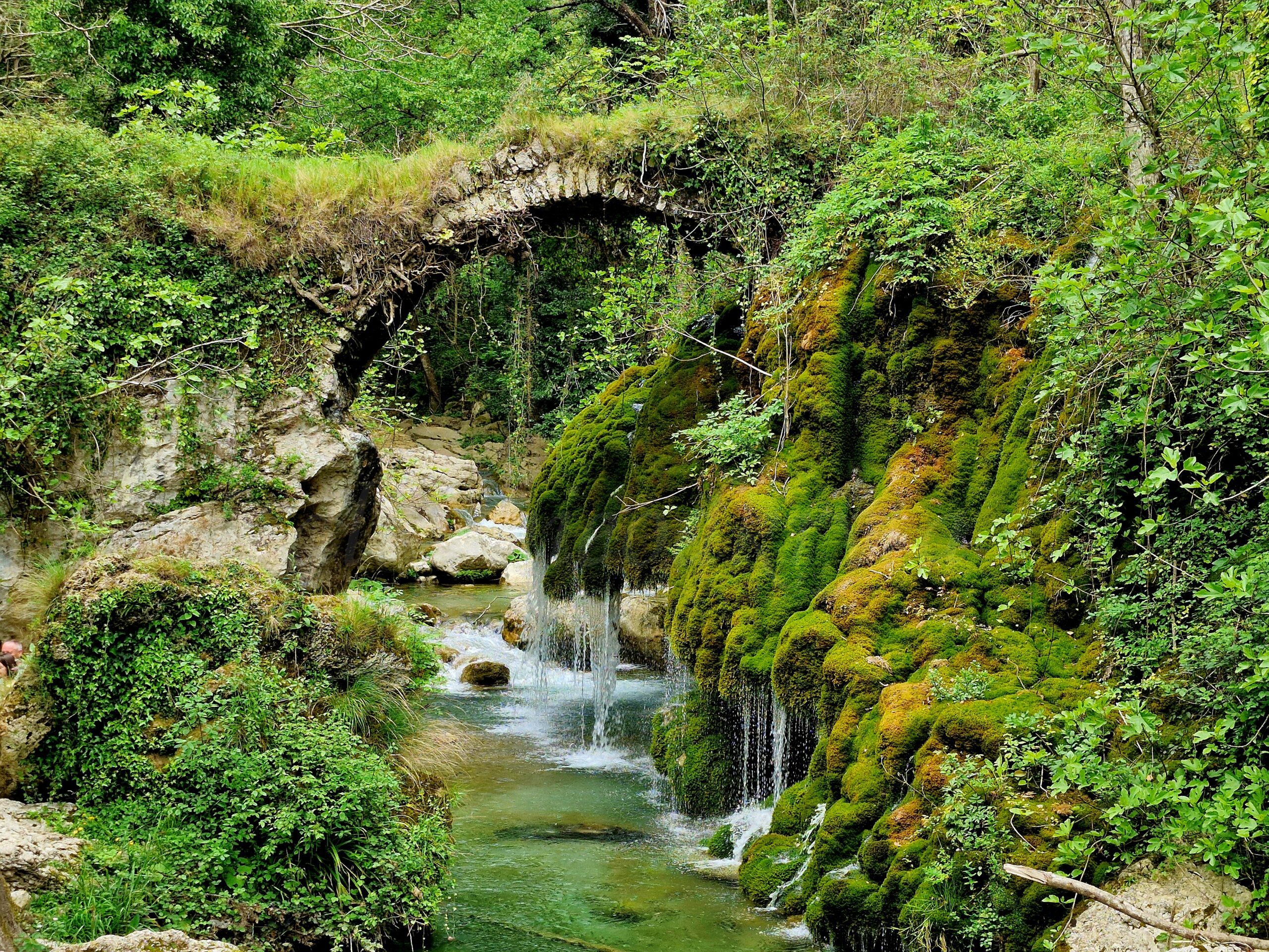 After entering, we went down and, after passing the wooden house on the left, we went down a little further to the wooden bridge and saw the place where, according to legend, Venus committed the murder of the shepherd. Indeed, the view from the bridge is magical: narrow streams of water flow down from the green growth. An old stone bridge dominates it. The impression is even more fairy-tale-like after standing on the bank, right opposite the Hair of Venus. From there, you can see how the water flows through the moss and lichens, giving the plants a beautiful green color. It looks a bit like the plants are hiding under a veil.
