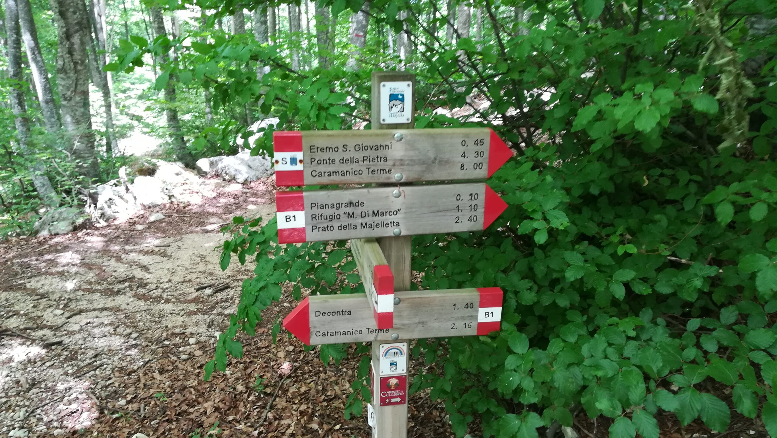 The Eremo San Giovanni all’Orfento hike hike begins in Caramanico Terme, but it was not very easy to find exactly where. The best option is just to use GPS, as we did – we typed “Eremo San Giovanni all’Orfento hike ,” and it led us to the car park. A short distance into the forest, we found a small wooden sign indicating the S route and set off.