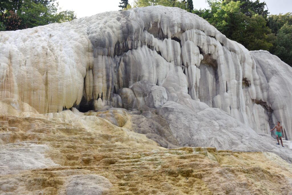 The water flows from the pool heads towards the steep slope of Parco dei Mulini, with the ruins of old mills. I wouldn’t say I was impressed by them, but I’m spoiled. Being in so many places, I became picky. Anyway, in the park you can also soak your feet in the hot streams, additionally sizzlig/frying in the sun. I was there in July and felt like in a convection oven; there are just a few tree, so no shade.