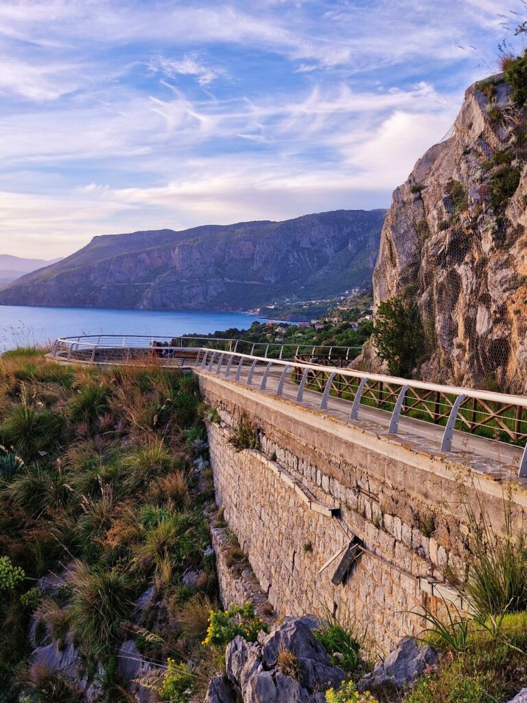 Hanging from the cliffs of Maratea and the Gulf of Policastro, the Sky Walk has two entrances: directly onto the ‘walkway’, and a short up and down the mountainside, so more in line with the ‘hiking in Campania’ option. Whichever you choose, you will reach a glass terrace from which we admired the deep blue of the Tyrrhenian Sea mingling with the blue of the sky.
