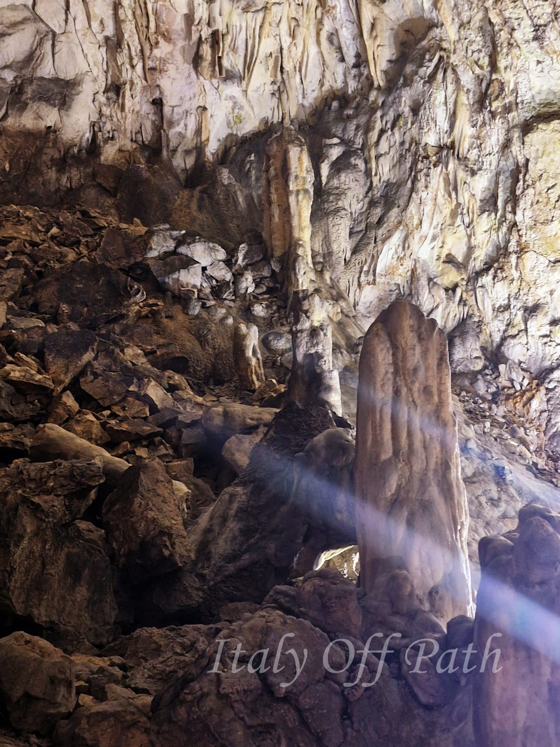 Można by się spodziewać, że w takim miejscu będzie cisza… ale nie, milczenie jest wbrew włoskiej naturze. Dlatego jaskinię wypełniły świsty, szepty, chrząkanie, nawoływania i inne dźwięki, które wydawali zwiedzający ją Włosi. I donośny głos przewodnika. Według niego, podczas II wojny światowej, tubylcy ukrywali się w grocie w bombardowań Abruzji przez aliantów. Do dzisiaj na ścianach pieczary widać ich zapiski i notatki.