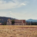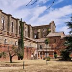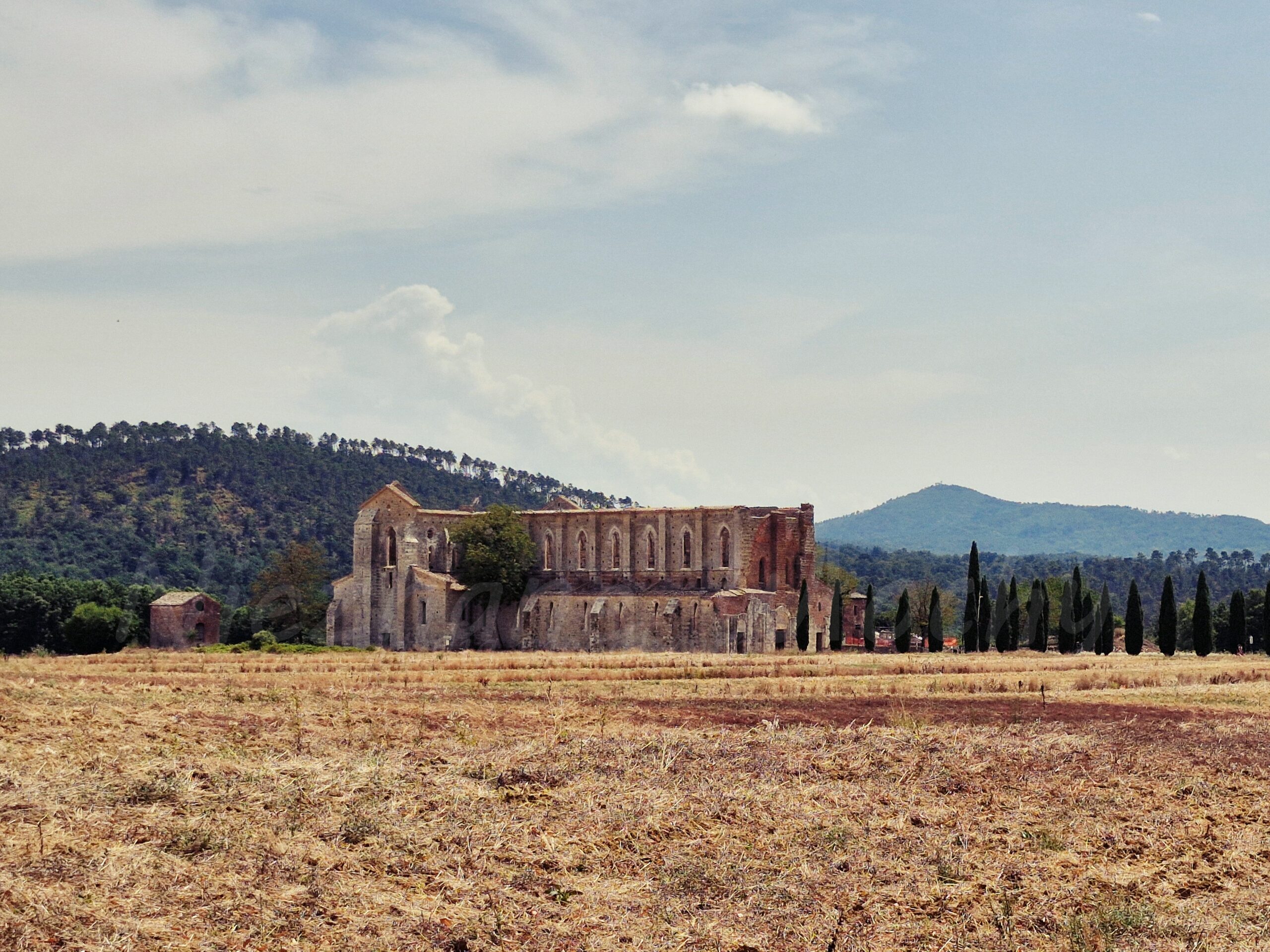 The never-finished abbey and hermitage of San Galgano is located about 30 km from Siena; When you arrive at the site, it is impossible not to notice the impressive remains of the monastery from a distance.