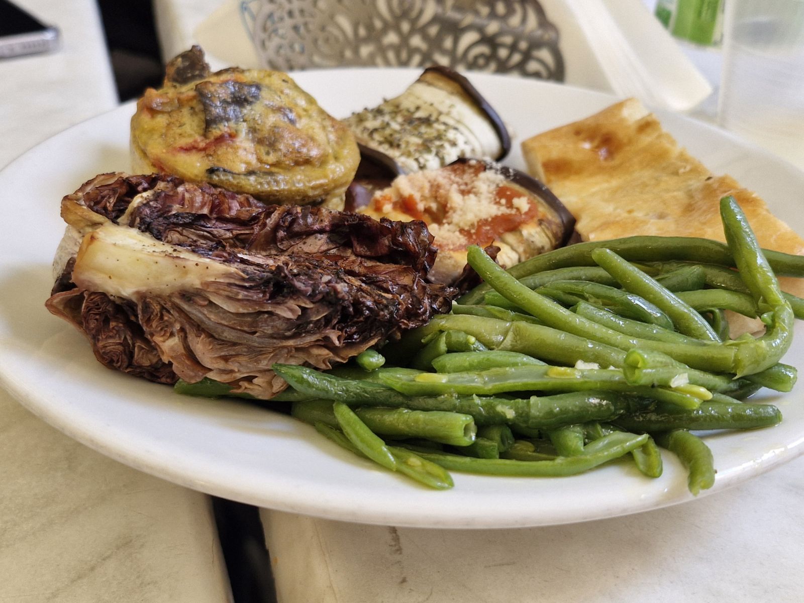6 pieces of typical Sicilian snacks, i.e. grilled veggies and some fried stuff.