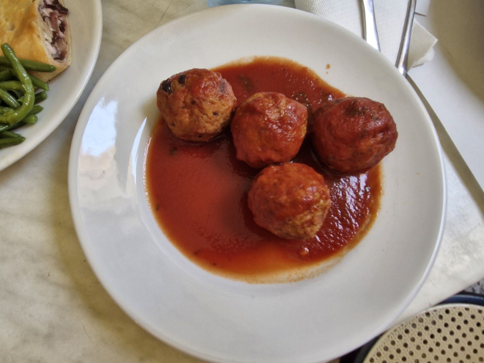 I had a piece of lasagne with pistachio and mortadella, Mauro opted for pasta with tomato sauce, meat, and pieces of pork rind. It sounds bleh, but it tastes very good.